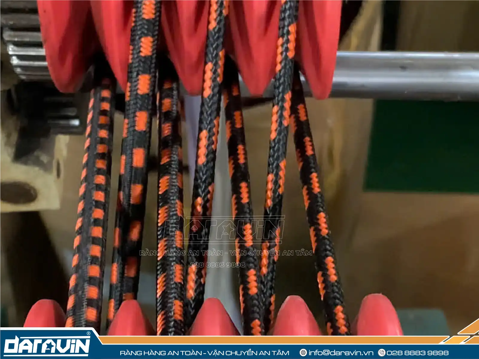 Một kỹ thuật viên sẽ gom một bó gồm hàng chục sợi cao su tự nhiên và đặt vào lõi trung tâm của máy. Ngay lập tức, hàng trăm con suốt chứa sợi PP bắt đầu "vũ điệu" của mình. Chúng di chuyển theo một quỹ đạo được lập trình sẵn, đan xen vào nhau với tốc độ chóng mặt, dệt nên một lớp vỏ bảo vệ dày dặn, đều đặn và liền mạch quanh lõi cao su. Tiếng máy chạy đều đặn chính là bản nhạc của sự chính xác, đảm bảo rằng mỗi centimet của sợi dây đều có chất lượng đồng nhất.