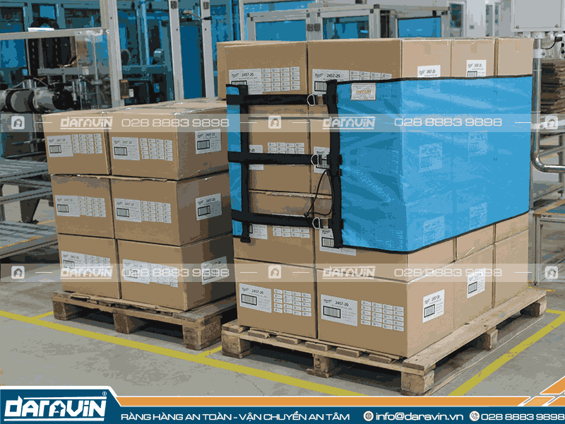 Tổ chức hàng hóa gọn gàng: Giữ hàng hóa trên pallet chắc chắn, ngăn ngừa tình trạng đổ vỡ, lộn xộn trong kho.