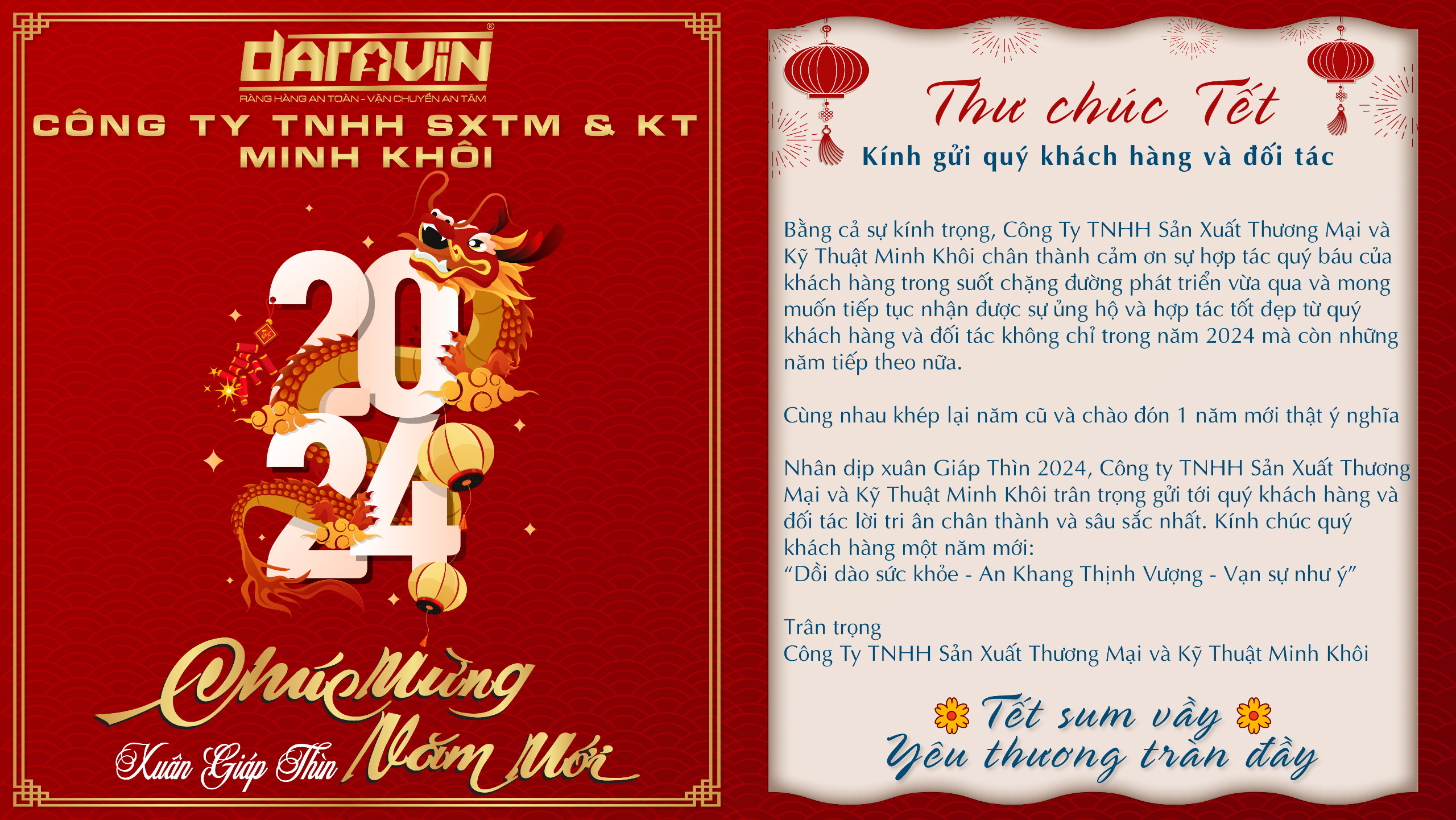 Nhân dịp xuân Giáp Thìn 2024, Công ty TNHH Sản Xuất Thương Mại và Kỹ Thuật Minh Khôi thương hiệu DARAVIN trân trọng gửi tới quý khách hàng và đối tác lời tri ân chân thành và sâu sắc nhất. Kính chúc quý khách hàng một năm mới: “Dồi dào sức khỏe-An Khang Thịnh Vượng- Vạn sự như ý”