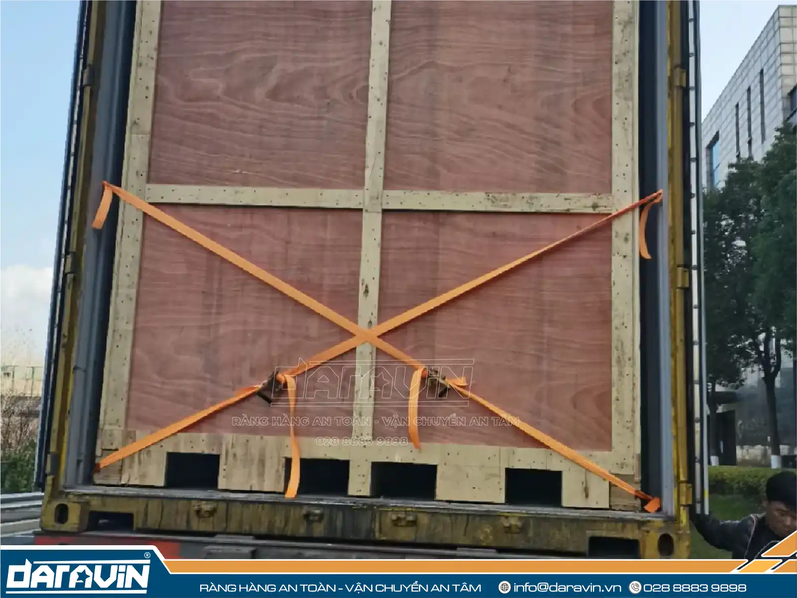 Nguyên tắc hoạt động: Dây chằng được móc trực tiếp từ một điểm neo trên xe đến một điểm neo trên kiện hàng. Thay vì đè xuống, các sợi dây lúc này hoạt động như những "bức tường" vô hình, trực tiếp ngăn cản sự dịch chuyển của hàng hóa theo một hướng nhất định (ngang, dọc).