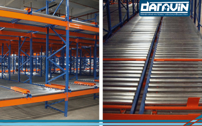 Với kết cấu con lăn, hàng hóa dễ dàng được luân chuyển vào bên trong hoặc ra ngoài bằng cách trượt di động trên bề mặt kệ. Loại kệ chứa này thường được sử dụng trong các kho có số lượng hàng hóa lớn, cần xuất nhập theo nguyên tắc nhập trước - xuất trước (FIFO).