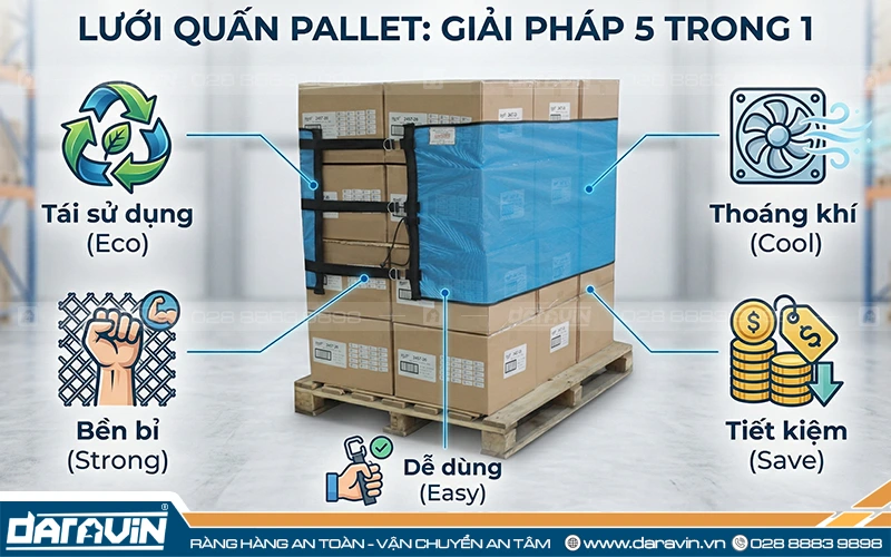 Điểm khác biệt của Daravin nằm ở chất lượng lưới chắc chắn, độ bền cao và có thể sử dụng lâu dài. Lưới được thiết kế theo từng loại pallet và đặc thù ngành hàng, giúp tối ưu hiệu quả khi sử dụng. Ngoài ra, nguồn hàng luôn có sẵn số lượng lớn, sẵn sàng đáp ứng nhanh khi doanh nghiệp cần.