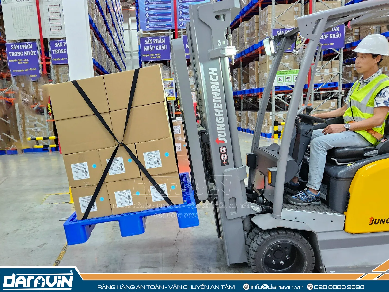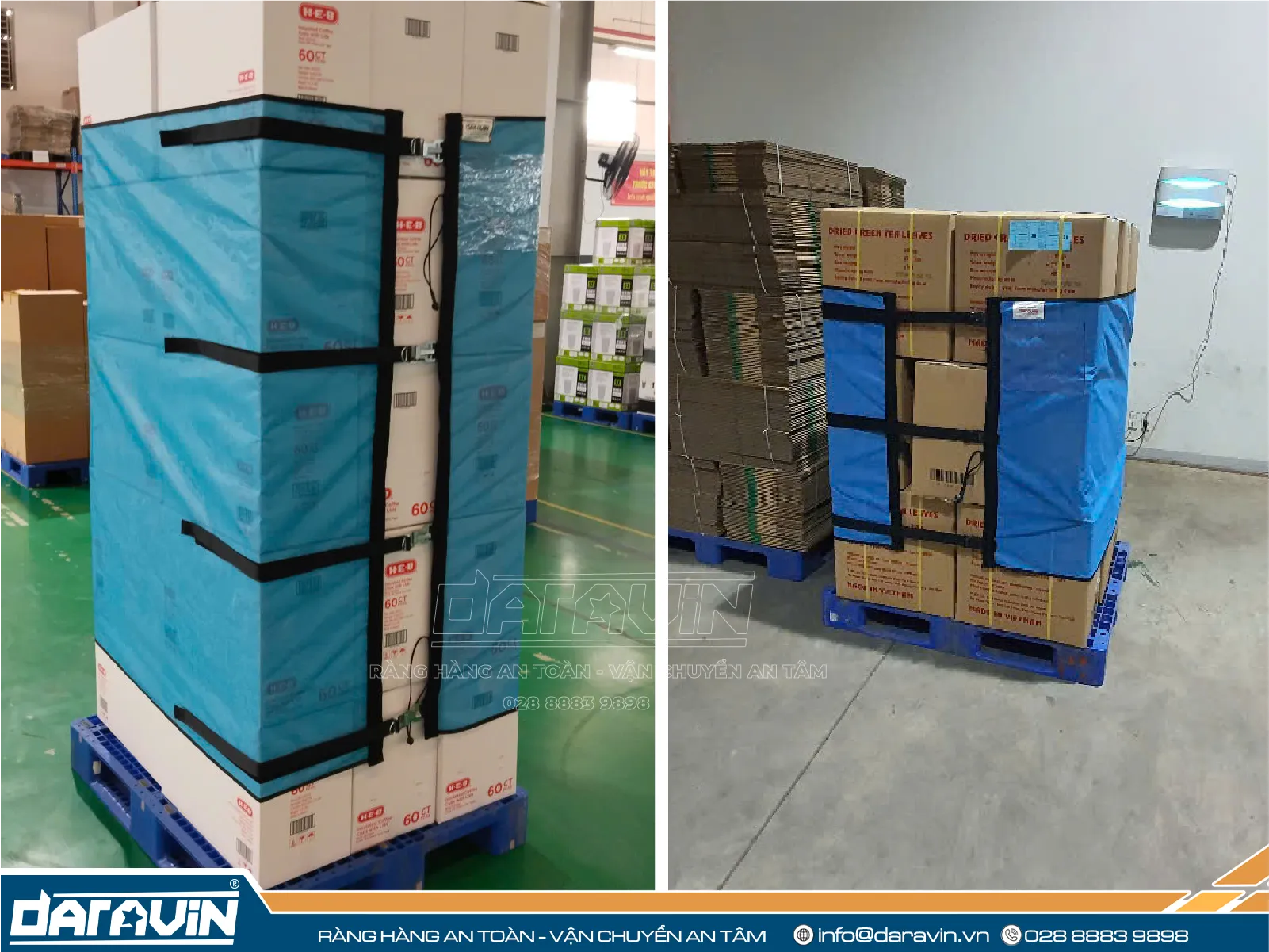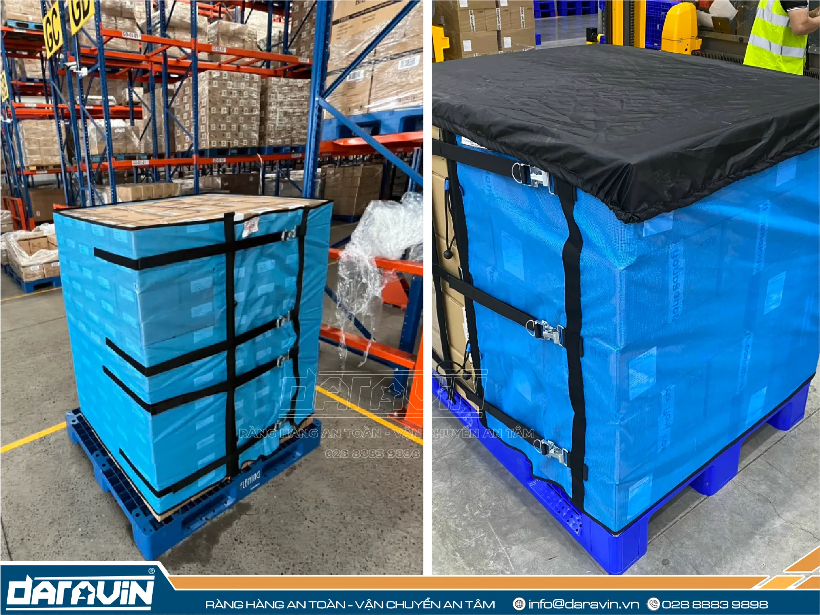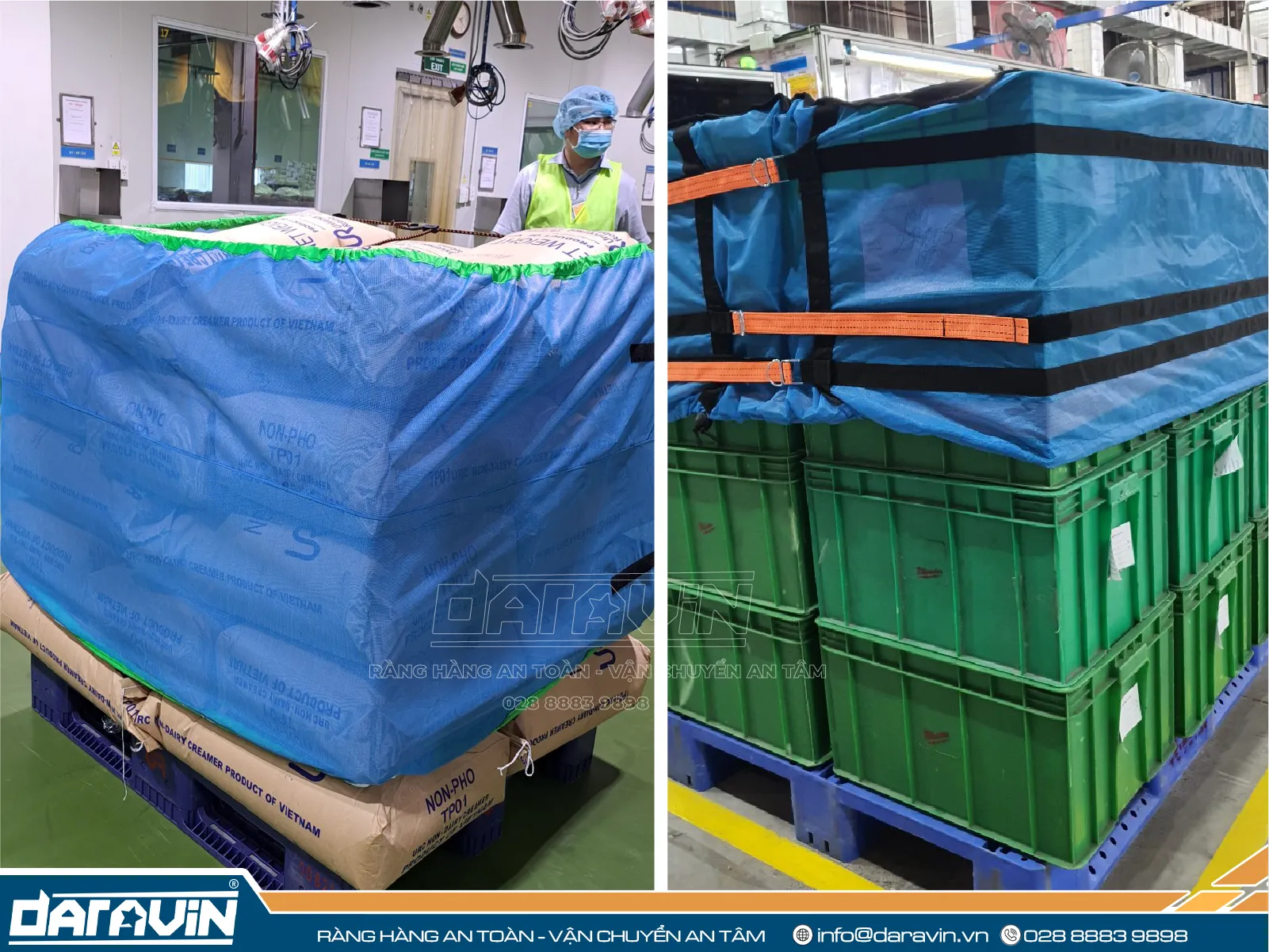 Để tăng cường độ ổn định và an toàn cho hàng hóa khi đặt trên pallet nhựa, doanh nghiệp có thể kết hợp sử dụng lưới quấn pallet do DARAVIN sản xuất. Khác với màng PE quấn tay truyền thống, lưới quấn pallet làm từ polyester có khả năng cố định hàng hóa chắc chắn, dễ thao tác và tái sử dụng nhiều lần. Giải pháp này không chỉ giúp bảo vệ hàng hóa tốt hơn trong quá trình di chuyển và lưu kho, mà còn góp phần giảm thiểu rác thải nhựa, hướng đến vận hành bền vững.