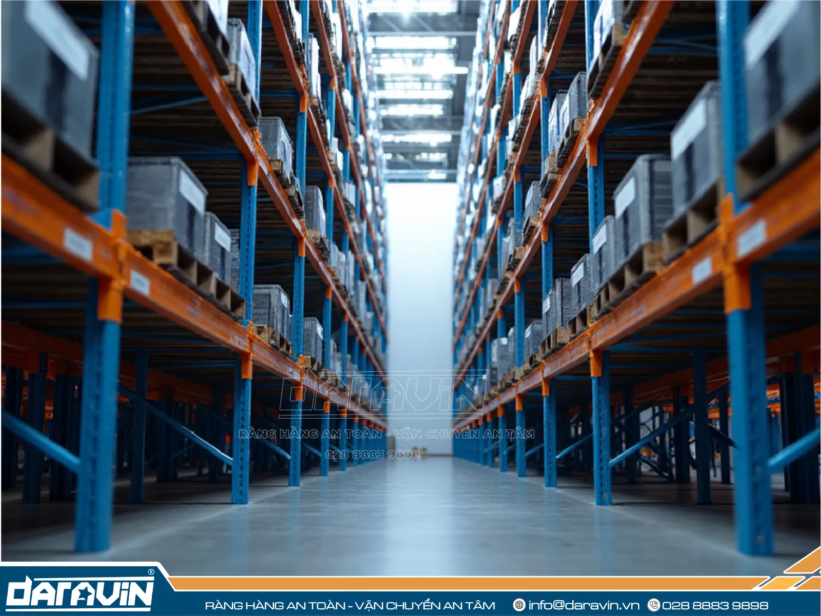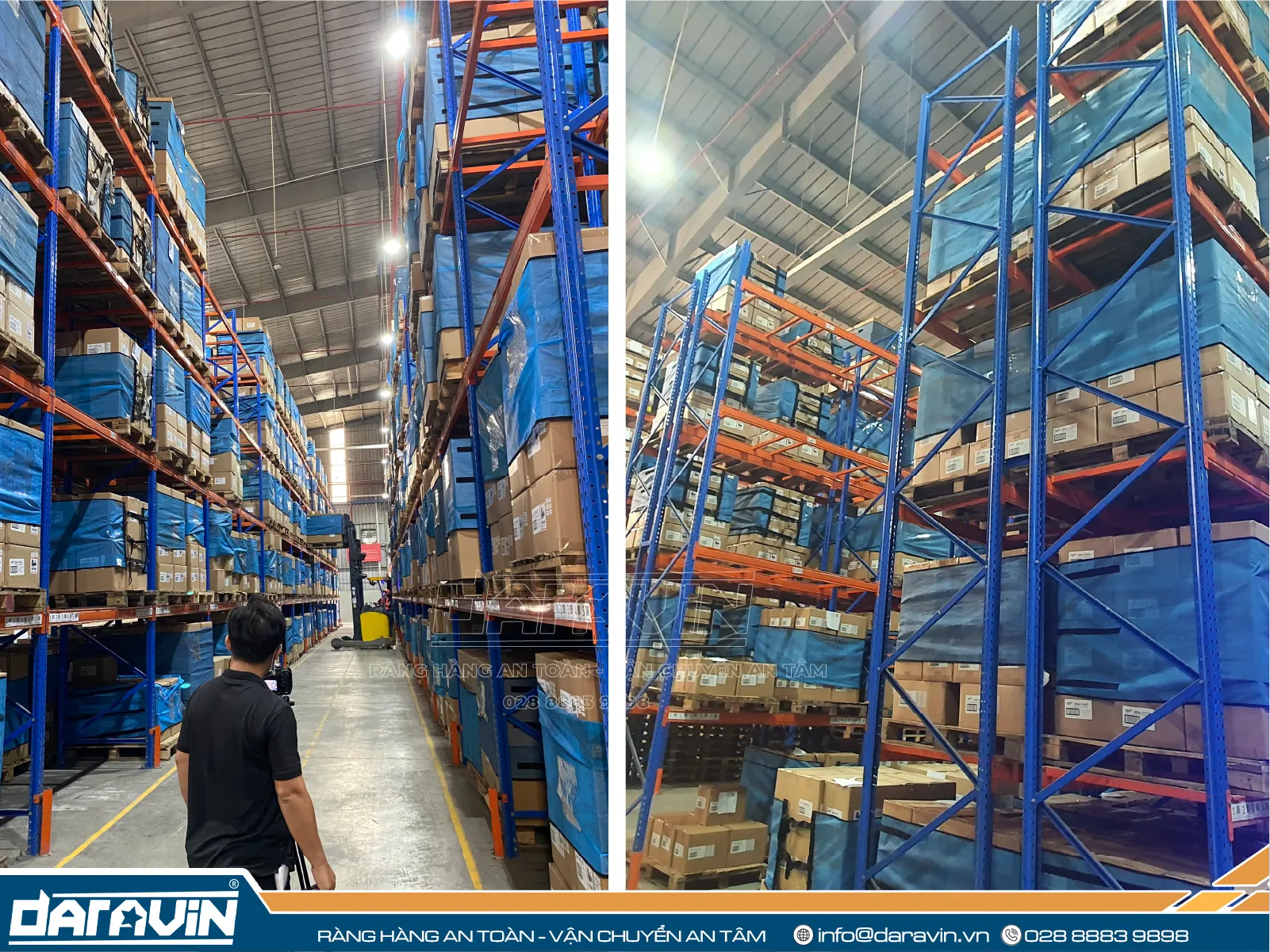 So sánh với kệ Selective: Kệ Selective dễ dàng tiếp cận từng pallet nhưng mật độ lưu trữ thấp hơn nhiều.