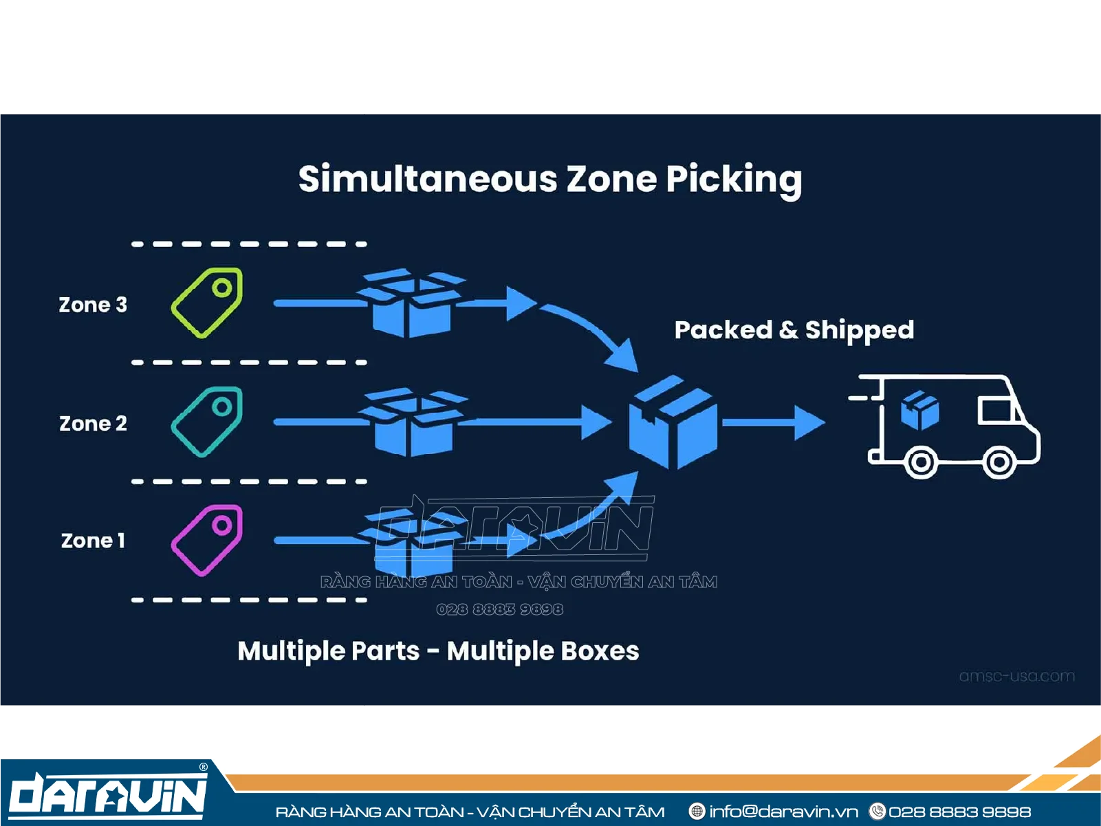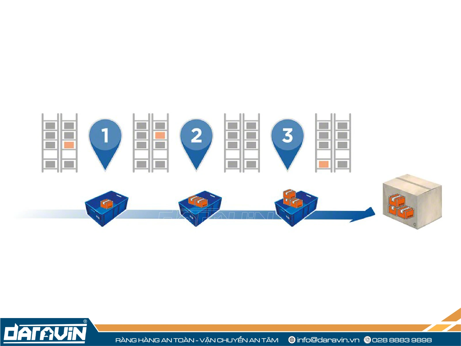 Zone Picking (Soạn theo khu vực): Mỗi nhân viên phụ trách một khu vực riêng, đơn hàng sẽ được chuyển từ khu này sang khu khác để hoàn thiện.