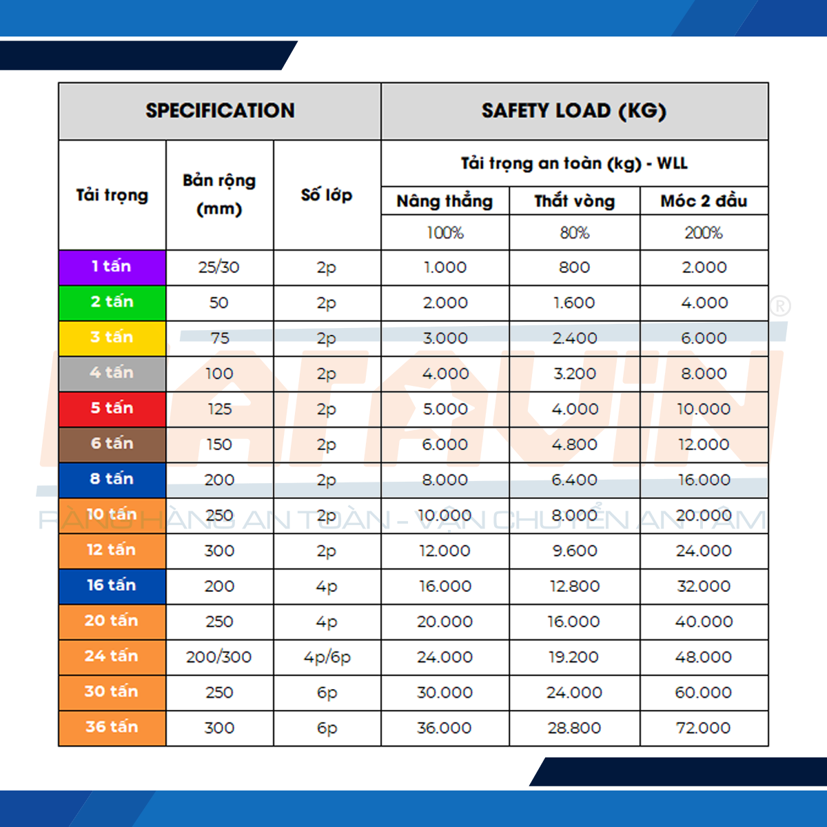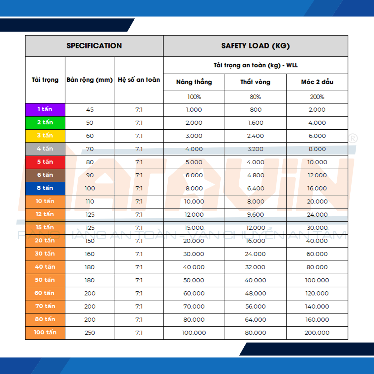 Bảng thông số kỹ thuật dây cáp vải cẩu hàng theo tải trọng