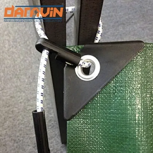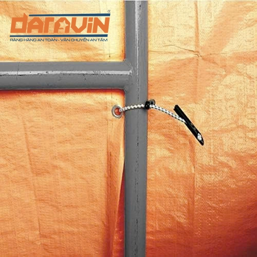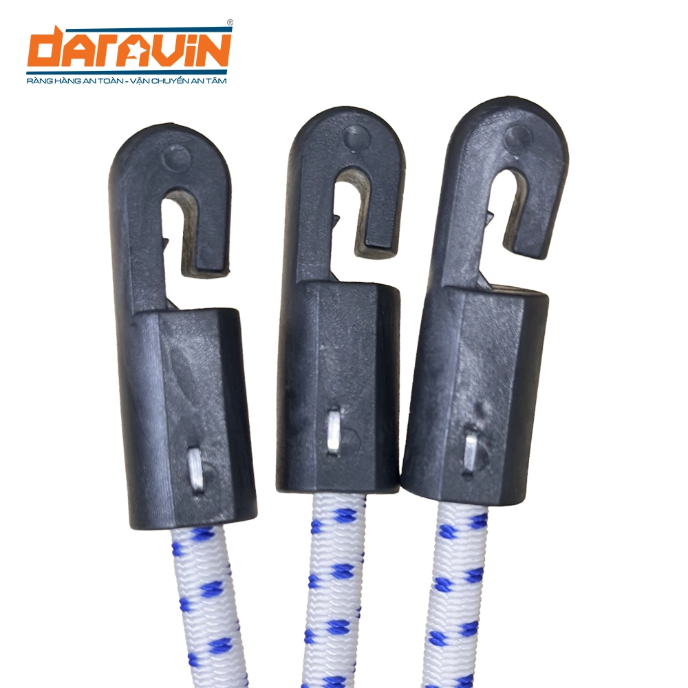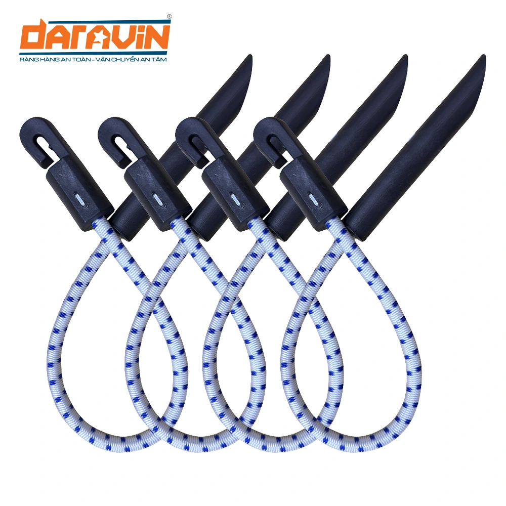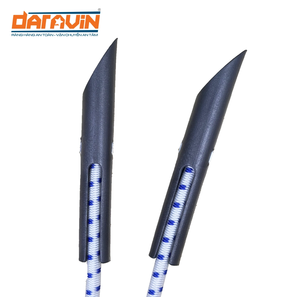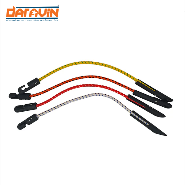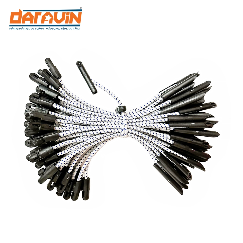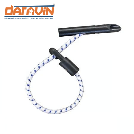 The pointed plastic toggle is designed for easy threading through an eyelet. Once inserted, the cord is wrapped around a support and then secured by hooking it onto the elastic shock cord, providing a firm and reliable hold.