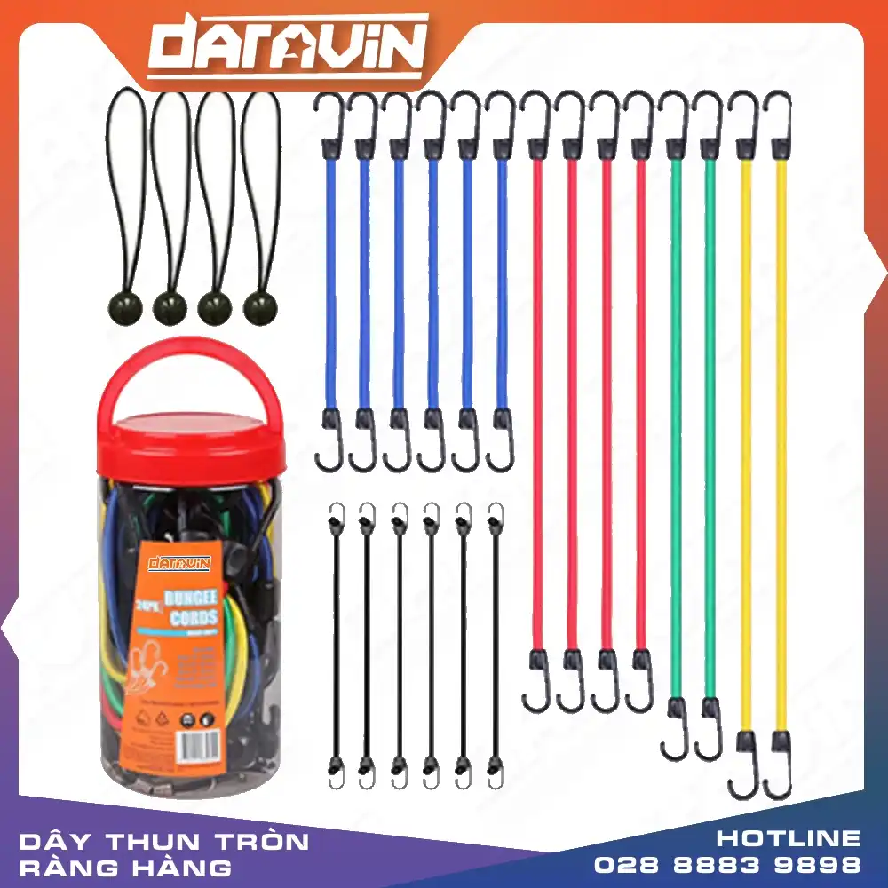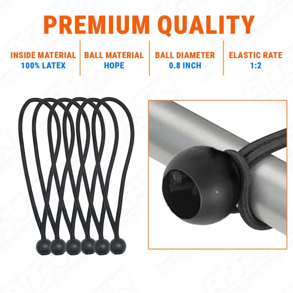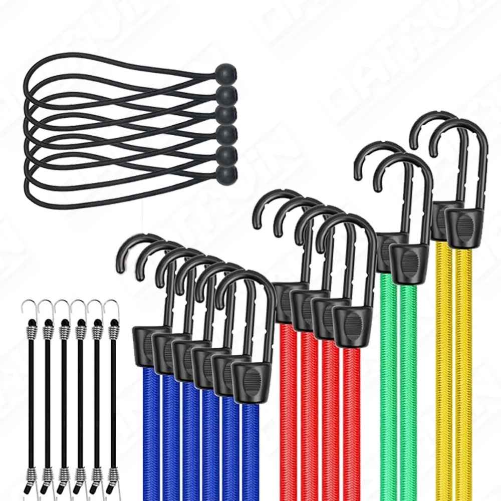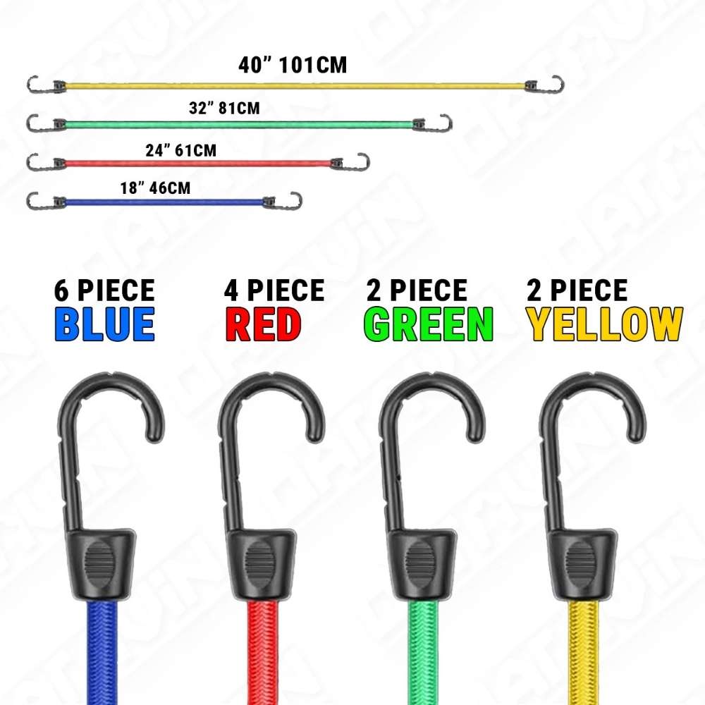 - Multiple Sizes: (6) pc. x 18”, (4) pc. x 24”, (2) pc. x 32”, (2) pc. x 40” bungee cords; (6) pc. x 10"mini cords; (4) pc. x 8” canopy ties UV resistant cord jacket.