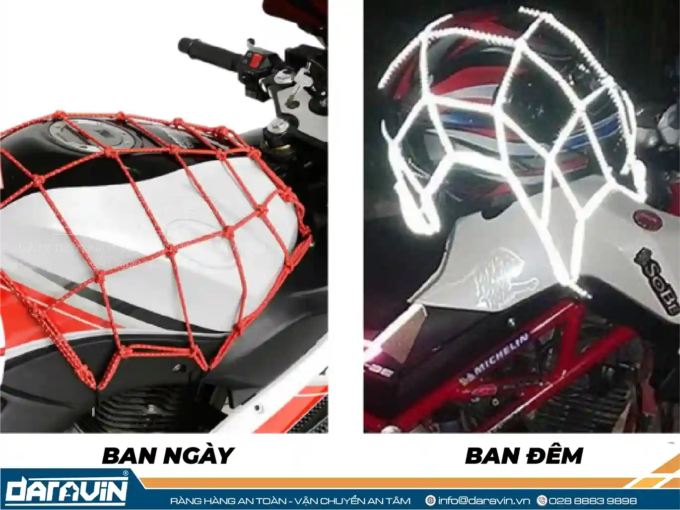 Khi di chuyển bằng xe máy, đặc biệt là vào ban đêm, lưới thun ràng đồ có phản quang không chỉ giúp cố định hành lý chắc chắn mà còn tăng tính an toàn nhờ khả năng phát sáng trong điều kiện thiếu ánh sáng. Đây là phụ kiện không thể thiếu cho các phượt thủ, giúp chuyến đi thêm trọn vẹn và an tâm hơn. Tuy nhiên, để phát huy tối đa công dụng, bạn cần biết cách sử dụng đúng chuẩn. Cùng DARAVIN tham khảo hướng dẫn chi tiết dưới đây để đảm bảo hành trình an toàn và suôn sẻ.