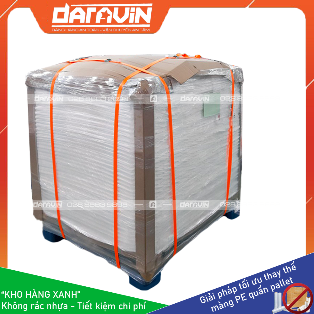 - Tiết kiệm chi phí dài hạn: Màng PE truyền thống quấn hàng pallet chỉ sử dụng được 1 lân, khi xuất hàng đi thì ta không sử dụng lại được. Với giải pháp Kho Hàng Xanh của DARAVIN có thể tái sự dụng lại nhiều lần giúp doanh nghiệp tiết kiệm chi phí mua màng PE hàng tháng, tiết kiệm chi phí điện năng cho máy quấn PE, tiết kiệm chi phí cho bên môi trường thu gom và xử lý rác thải nhựa từ PE.