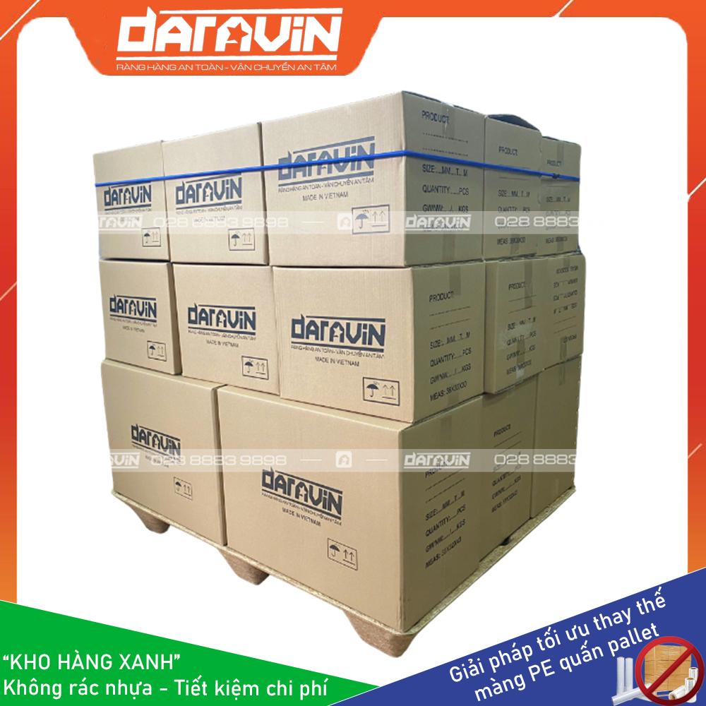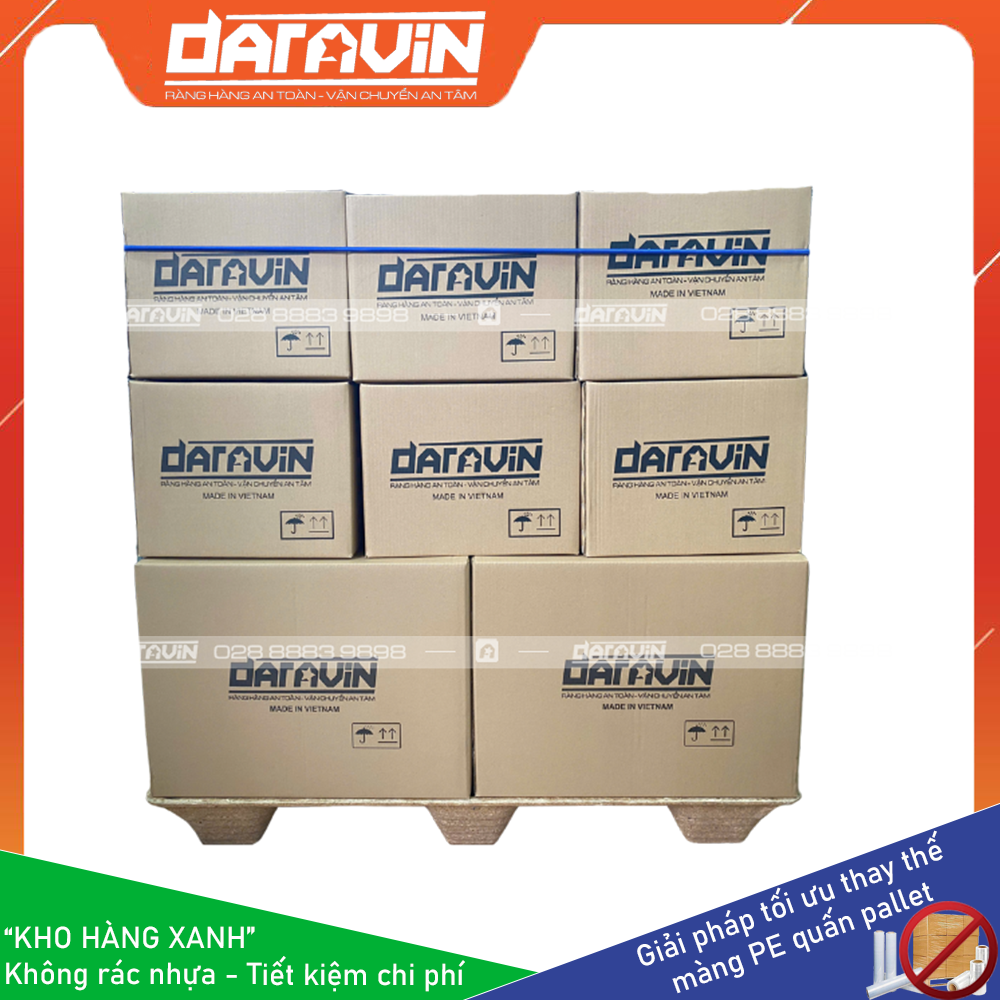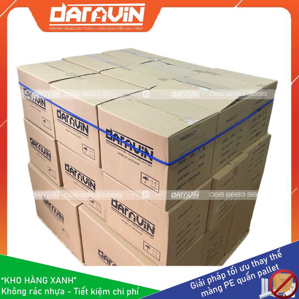- Tiết kiệm chi phí dài hạn: Màng PE truyền thống quấn hàng pallet chỉ sử dụng được 1 lân, khi xuất hàng đi thì ta không sử dụng lại được. Với giải pháp Kho Hàng Xanh của DARAVIN có thể tái sự dụng lại nhiều lần giúp doanh nghiệp tiết kiệm chi phí mua màng PE hàng tháng, tiết kiệm chi phí điện năng cho máy quấn PE, tiết kiệm chi phí cho bên môi trường thu gom và xử lý rác thải nhựa từ PE.
