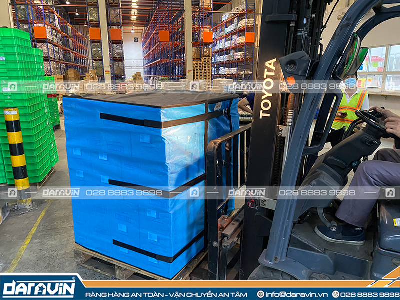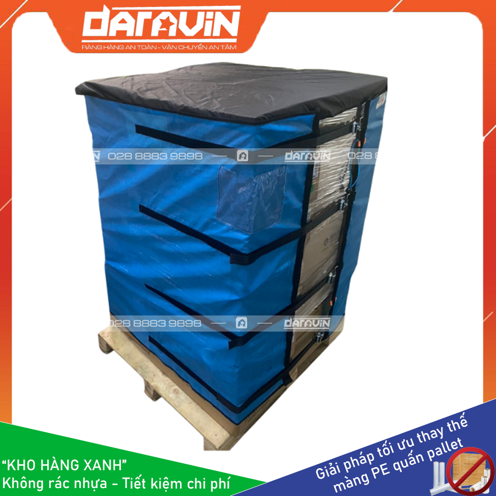 - Tiết kiệm chi phí dài hạn: Màng PE truyền thống quấn hàng pallet chỉ sử dụng được 1 lân, khi xuất hàng đi thì ta không sử dụng lại được. Với giải pháp Kho Hàng Xanh của DARAVIN có thể tái sự dụng lại nhiều lần giúp doanh nghiệp tiết kiệm chi phí mua màng PE hàng tháng, tiết kiệm chi phí điện năng cho máy quấn PE, tiết kiệm chi phí cho bên môi trường thu gom và xử lý rác thải nhựa từ PE.