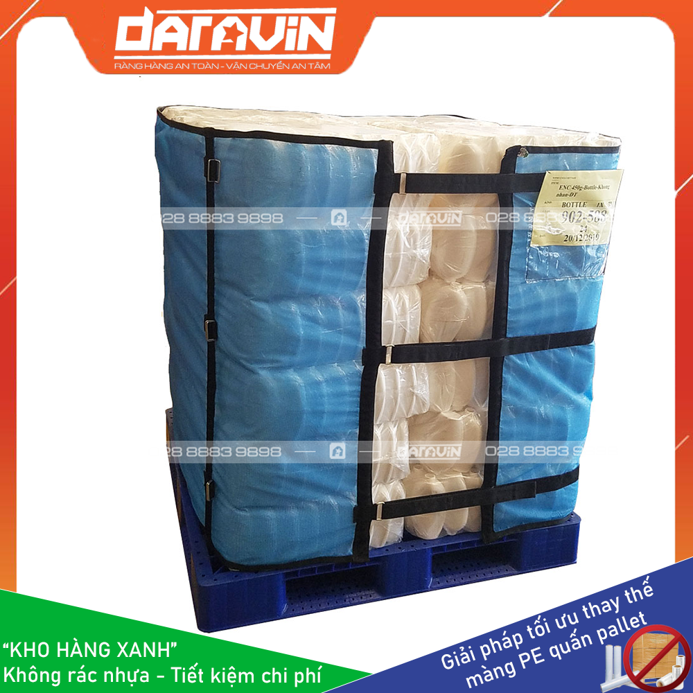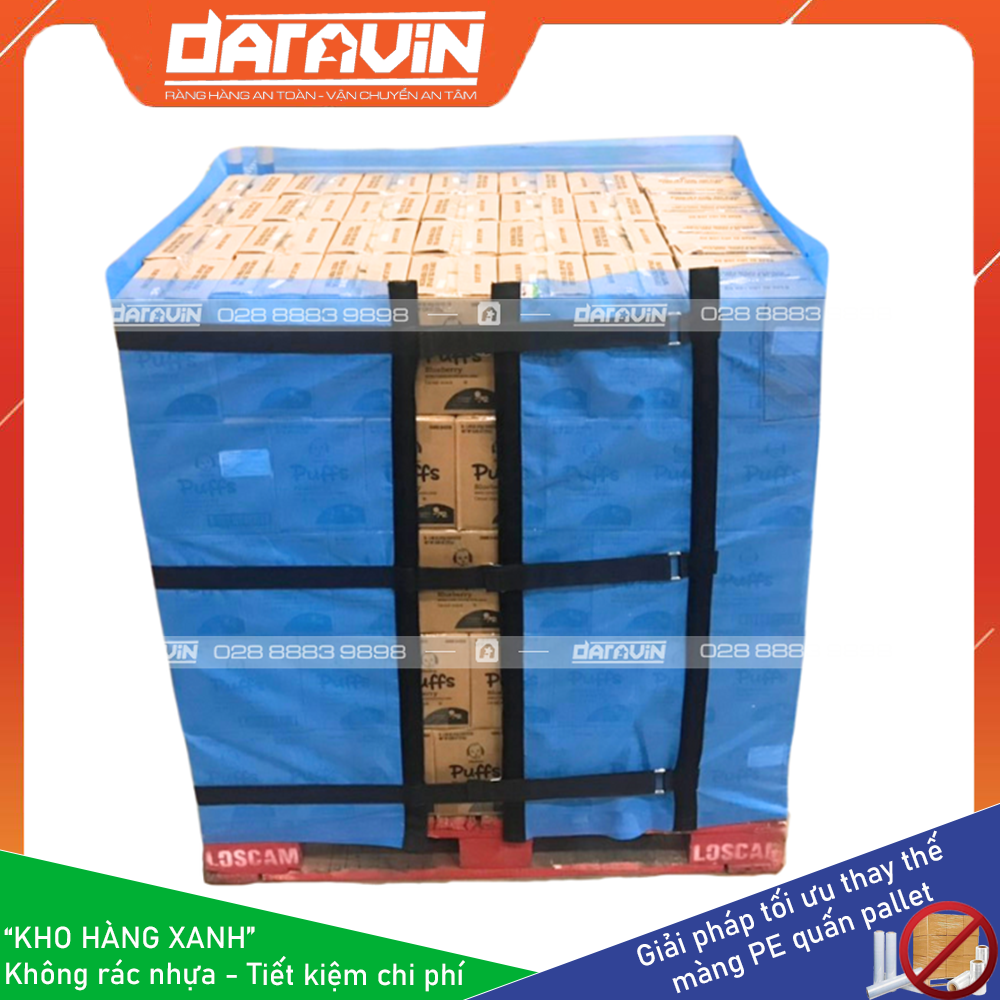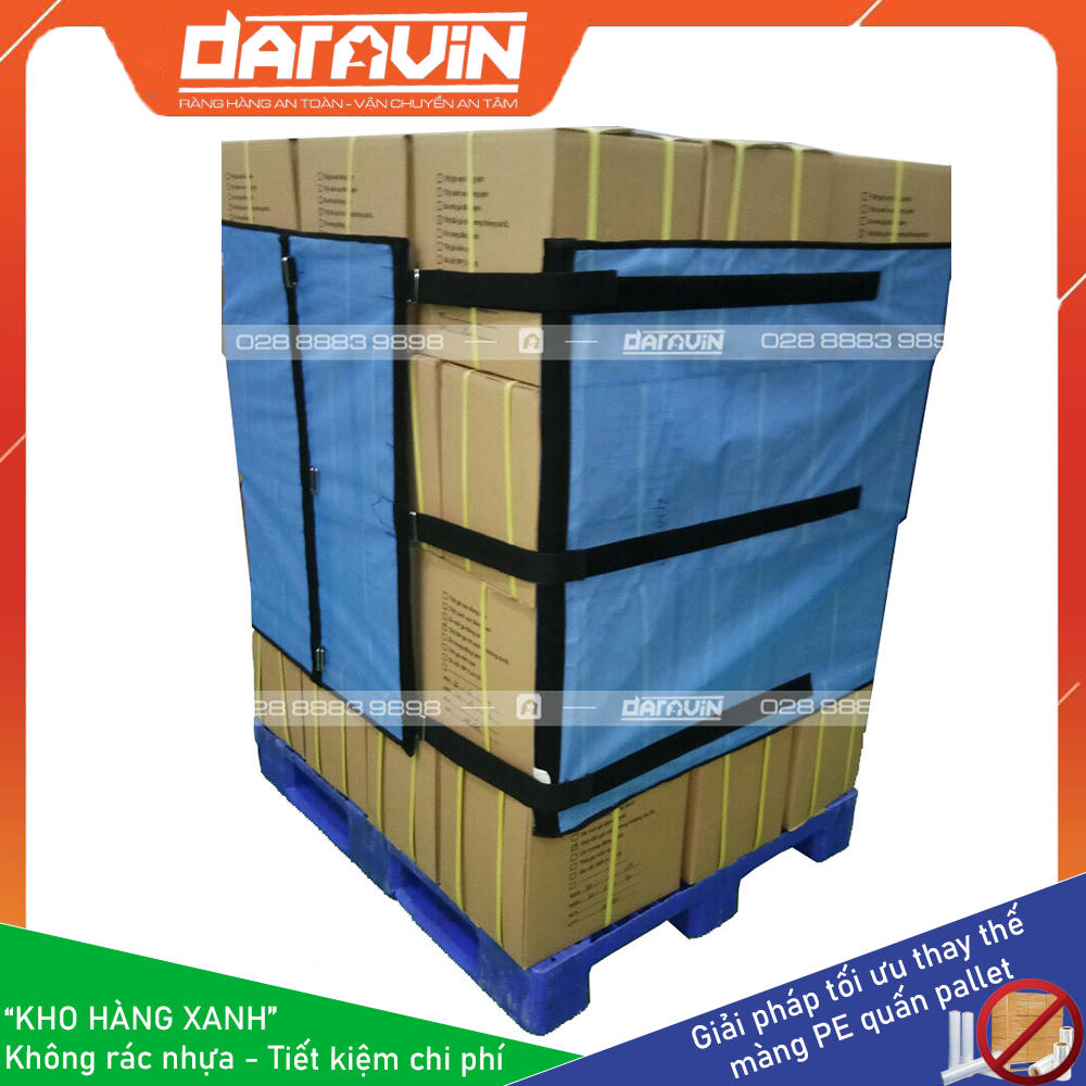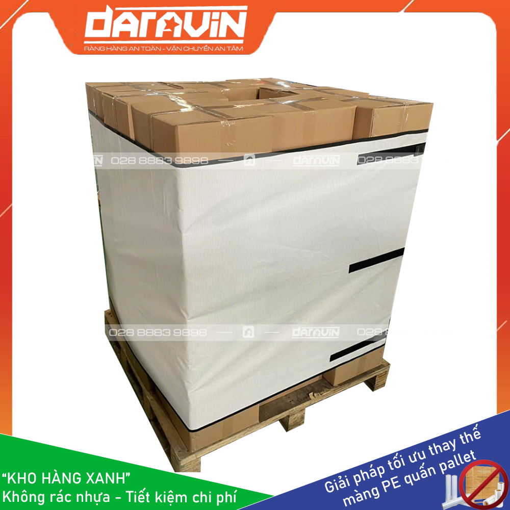 - Tiết kiệm chi phí dài hạn: Màng PE truyền thống quấn hàng pallet chỉ sử dụng được 1 lân, khi xuất hàng đi thì ta không sử dụng lại được. Với giải pháp Kho Hàng Xanh của DARAVIN có thể tái sự dụng lại nhiều lần giúp doanh nghiệp tiết kiệm chi phí mua màng PE hàng tháng, tiết kiệm chi phí điện năng cho máy quấn PE, tiết kiệm chi phí cho bên môi trường thu gom và xử lý rác thải nhựa từ PE.